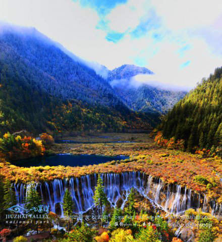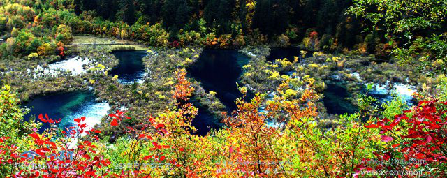 九寨溝四周群山聳峙,有雪峰數(shù)十座,高插云霄,終年白雪皚皚。河谷地帶奇水薈萃,其間有成梯形分布的大小湖泊114個,瀑布群17個,鈣華灘流5處,泉水47眼,湍流11段,以1870米的海撥高差,在12 座雪峰之間穿林跨谷,珠連玉接,呈Y字型串珠,逶迤近60公里,形成了中國唯一、世界罕見的以高山湖泊群和瀑布群以及鈣華灘流為主體的風景名勝區(qū)。湖泊小者數(shù)平方米,最大的長海長達7公里。湖水終年碧藍澄澈,色彩斑讕,在陽光照射下,呈現(xiàn)出藍、黃、橙、綠等多種色彩,絢麗奪目。天氣晴朗時,藍天、白云、雪山、森林倒映湖中,水光浮翠,美麗如畫,并隨季節(jié)推移呈現(xiàn)出不同的色彩和風韻,有“九寨歸來不看水”之說。