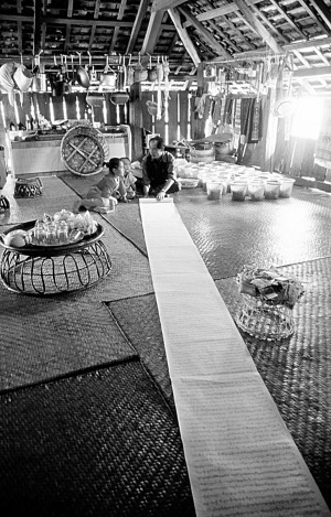 這時(shí),走來一個(gè)大佛爺和兩個(gè)老人,因?yàn)榉鹱娌粫?huì)開口說話,他們是來替佛祖給玉波念“薩拉帥”祝詞的。先由大佛爺念了一段《祝福經(jīng)》,給玉波滴了水,然后兩個(gè)老人打開玉波那寬半尺、長(zhǎng)足有7米多的“薩拉帥”祝詞。玉金說,這祝詞是請(qǐng)曼降村的前大佛爺康朗寫的(康朗:指佛爺還俗的人)。來倆個(gè)老人念,是考慮到可以換著念。玉波的奶奶也想到了玉波可能跪不習(xí)慣,就帶來了墊子,讓玉波或跪或坐,因?yàn)槟钔曜T~要兩三個(gè)小時(shí)。祝詞的內(nèi)容大致是這樣的:“我是一個(gè)在菩提樹下長(zhǎng)大的女孩,在佛祖的護(hù)蔭下,臉長(zhǎng)得像菩提樹葉一樣又嫩又青,身材像檳榔樹一樣苗條好看,心像金鹿一樣善良。當(dāng)我年滿12歲以后,人世間的喜樂情愛,貧窮苦難就會(huì)來到我的面前。今天在父母的幫助下,我準(zhǔn)備了這些物品來賧給佛祖。我千祈禱萬祈求,希望佛祖保佑我織布是行家,丈夫種田是能手。命里見火能親,遇水能溶。生的孩子女的長(zhǎng)得像一只蜜蜂,男的長(zhǎng)得像一頭水牛,用他們的勤勞贍養(yǎng)雙親。從小就聽話,自幼就很乖。在母親的懷里不亂哭,在父親的背上不亂搓……”