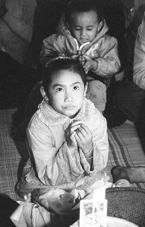 看到玉波家賧奉的物品一份份的被人領(lǐng)走,我所關(guān)注和等待的是看哪個(gè)小和尚能得到玉波的“薩拉帥”。因?yàn)榘催@里的習(xí)慣,凡得到“薩拉帥”的小和尚一般都會(huì)和小女孩交上朋友或認(rèn)做兄妹,成為終身的精神依托,有的還會(huì)結(jié)為夫妻。誰會(huì)得到玉波的這份“薩拉帥”呢?我在想。這時(shí),玉波的爺爺興沖沖地走來,告訴家人說:“薩拉帥賧給了’帕召’(傣語:佛祖。“帕”從字面來理解是“僧人”,但其含義實(shí)質(zhì)上多指“有福”,“召”,是王之意。連起來“帕召”就是“有福之王”)。”原來,玉波的“薩拉帥”分在了給佛祖的那份里。這可是最高級(jí)別的賧奉了,我從她全家人格外高興的臉上看出了這一點(diǎn)。這似乎預(yù)示著玉波的一生將會(huì)得到佛祖的特別關(guān)照!