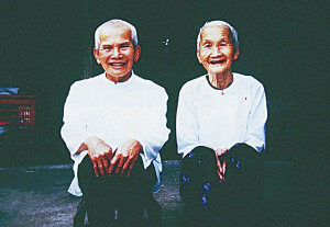 當(dāng)我來到時(shí),老人已經(jīng)入殮。我借機(jī)打量傣家這從不許外人參觀的、全家?guī)状硕妓诶镞叺纳衩氐呐P室。只見臥室是一個(gè)通廊,里邊一長溜的帕墊(傣家人用來睡覺的棉被)都收裹起來,棺材就橫放在臥室的中央,一個(gè)用竹子編成喇叭形狀的燈架里有一盞燃著的油燈;棺材的上面橫拉著一根筷子粗的尼龍繩,上面掛著一些筒裙衣物,想來可能是死者的;幾個(gè)男性老人圍著棺木而坐,往棺木上剪貼著白、綠、紫、黃幾種顏色的紙花。隨后而來的巖化告訴我說:“過世的老人已有82歲了。她生前為人隨和,很受寨子里晚輩的敬重。死前已臥床一個(gè)多星期,不吃不喝,也無疼痛跡象,正所謂天年已盡,壽終正寢。”巖化還向我介紹說:按傣族的習(xí)慣,死者一咽氣,親友便立即用溫水為死者洗澡、梳頭、洗臉(洗臉時(shí),由下向上,以示區(qū)別于活人),穿上新的衣、褲、襪、鞋,包新頭帕。還要在死者嘴里放入一小砣金或銀,稱作含口錢。然后用白布裹尸,將死者雙掌合十,放進(jìn)棺材里,用一塊方帕蓋臉。最后蓋上棺材,并通知寨子里的人。