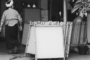 澆紙是在紙槽中進(jìn)行的,不但需要強(qiáng)勁的臂力,還需要相當(dāng)?shù)募?xì)心。在紙槽中舀水的時(shí)候,雙臂承受的重量不下10公斤,紙要澆得恰到好處,澆輕了紙就太薄,澆重了紙又太厚。太薄出不了好品相,太厚會(huì)增加成本。這是整個(gè)構(gòu)紙成品的關(guān)鍵,經(jīng)驗(yàn)老到的傣族老人,都不會(huì)在這道工序上馬虎。一雙手游走在澆紙槽,或輕輕拍打,或慢慢游弋,絮狀的纖維時(shí)而附著在手上,時(shí)而又歡呼雀躍地散開(kāi),頑皮得有點(diǎn)像芒團(tuán)村水塘邊遇上的那些孩子。憑感覺(jué)均勻了,老人這才輕輕將澆紙盤(pán)脫離水面,一眨眼功夫,一張構(gòu)紙便在盤(pán)上現(xiàn)出端倪。接下來(lái)的事就交給陽(yáng)光了,如果雨季來(lái)臨,構(gòu)紙就停止生產(chǎn)。所以說(shuō),芒團(tuán)構(gòu)紙常常浸漬著一種陽(yáng)光的味道。