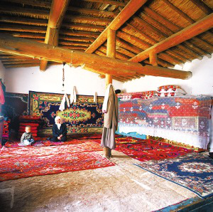 土房的室內(nèi)除有的搭火炕外,其它的裝飾和木房的一樣。到了采收紅花的季節(jié),鮮紅欲滴的紅花曬滿了院子,形成獨特的風(fēng)景。不論哪個房間,都可作為臥室,也用于待客,廚房和儲藏室單建,有的還單建馕坑。
