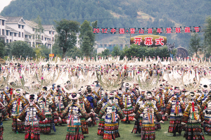 今年適逢雷山縣多個村寨過13年一次的鼓藏節(jié),2000余名苗族同胞在開幕式上再現(xiàn)了古老神秘的祭鼓儀式。鼓藏節(jié)也是緬懷先人、祭祀祖宗的古老節(jié)日,過節(jié)期間,家家宰豬祭祖,走親訪友,舉行跳蘆笙舞、斗牛等民間傳統(tǒng)活動。