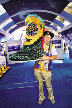 世界最大蒙古族繡靴亮相。靴長(zhǎng)70厘米,高1米。 資料圖片