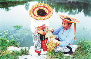 這是一個特別愛美的民族。男人們著裝瀟灑隨意,頭纏黑白相間的方格頭帕,倍顯英俊。女人們則身穿黛藍色對襟長衫,鑲著的紅布邊和紅布扣純?yōu)檠b飾。下著素艷相融的花裹裙,腰纏五顏六色的腰帶,頭上再配一個后面吊有長長彩須、狀似倒扣斗篷的火紅頭巾,把個茫茫綠野點綴得山花爛漫、如畫如詩。