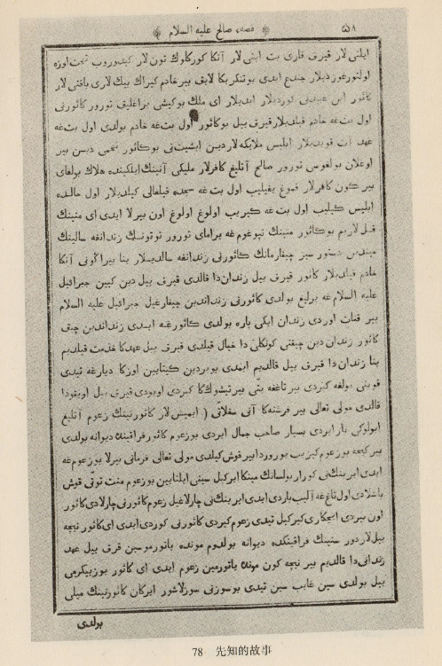 察合臺(tái)文著作。1899年喀山大學(xué)鉛印本。高25.5厘米,寬17.5厘米,共510頁。作者拉布古孜,寫于14世紀(jì)。圖為《先知薩立哈故事》中的一頁。寫的是異教徒們?cè)谀Ч淼闹瓜聦⒁蔀橄戎_立哈的父親卡斯瓦爾關(guān)進(jìn)地牢,天使奉真主之命使他逃出后與妻子見面的故事?,F(xiàn)藏新疆博物館。該書語言豐富生動(dòng),屬哈喀尼耶語(后期回鶻語)和察合臺(tái)語之間的過渡語言,一定程度上反映了當(dāng)時(shí)的口語,是研究維吾爾語言史和文學(xué)史的重要資料。