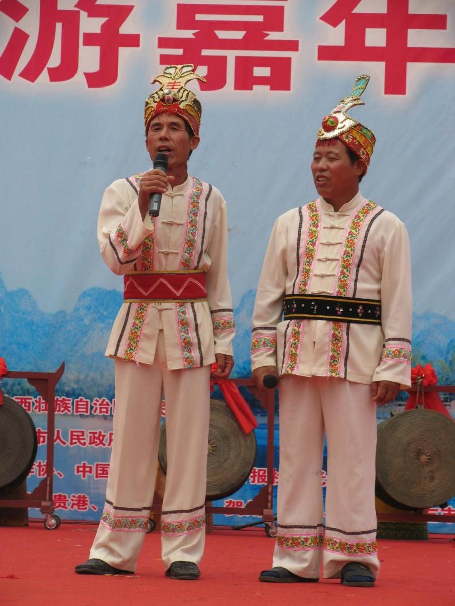 壯族傳統(tǒng)音樂(lè)主要是各種山歌曲調(diào),是產(chǎn)生于古代的詩(shī)歌、音樂(lè)、舞蹈三位一體的古老聲樂(lè)藝術(shù)。在壯族地區(qū),幾乎每個(gè)鄉(xiāng)都有幾個(gè)固定的曲調(diào),有用于敘事的平調(diào)、抒發(fā)歡快心情的喜調(diào)、平緩柔和細(xì)膩深沉的詩(shī)調(diào),富于教誨性的卜牙(老人)調(diào)和表現(xiàn)哀傷悲調(diào)等。曲式有支聲式、和聲式和復(fù)調(diào)式,用于獨(dú)唱、領(lǐng)唱、重唱、合唱的民歌調(diào)有相應(yīng)的曲式結(jié)構(gòu)。其中合唱又分為二聲部和三聲部。曲藝有末倫、唱師、比余等,唱師的唱本脫胎于經(jīng)詩(shī),一般為七言句式,以一鼓一鑼過(guò)門(mén),無(wú)伴奏。曲牌各地不一,每個(gè)地方一般由AB調(diào),比較固定。末倫流傳于桂西南地區(qū),來(lái)源于巫調(diào),發(fā)展成為曲藝。其詞為七言或五言,上下句式,以三弦伴奏,藝人自彈自唱,詞很優(yōu)美。內(nèi)容有說(shuō)故事、訴苦情、嘆離別等,可長(zhǎng)可短,形式靈活。比余流傳于紅水河中游東蘭、鳳山一帶,詞為長(zhǎng)短句,腰腳韻,寓言式或隱喻式,生動(dòng)活潑。演唱時(shí),藝人與聽(tīng)眾互相呼應(yīng),氣氛熱烈。