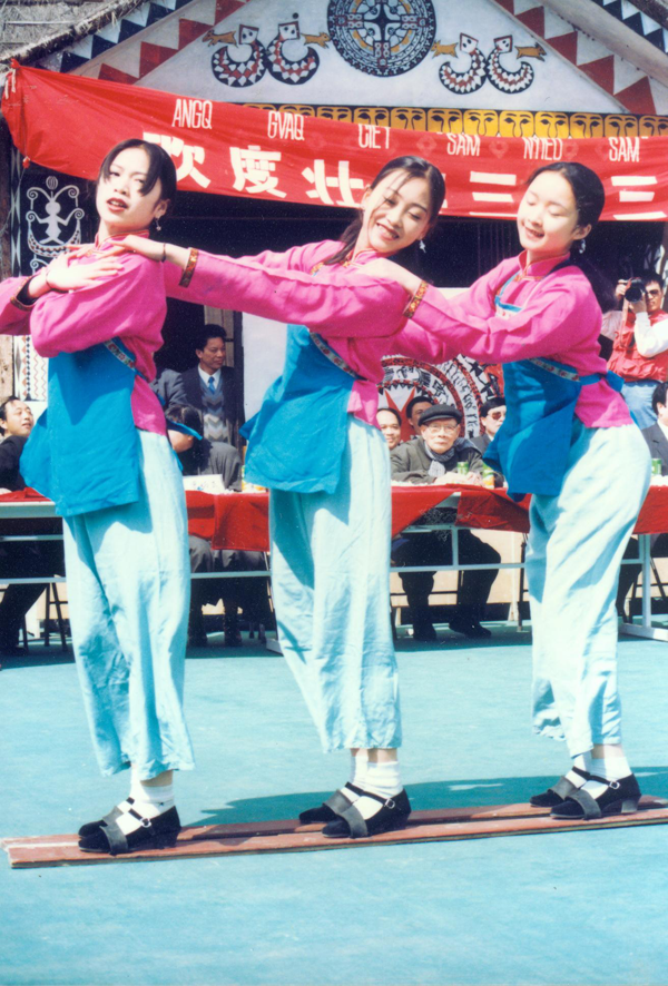 壯族傳統(tǒng)的娛樂(lè)性舞蹈主要是在節(jié)日或喜慶期間舉行。類型主要為模擬勞動(dòng)舞和擬獸類舞兩種。模擬勞動(dòng)舞表現(xiàn)壯族人民的生產(chǎn)勞動(dòng)的樂(lè)趣。如紅水河流域的壯族在春節(jié)舉行的孝蛙婆活動(dòng)中所跳的撈蝦舞、捕魚舞、狩獵舞、撒秧舞、插田舞、收割舞。壯族各地流行的扁擔(dān)舞、采茶舞、繡球舞、舂堂舞、板鞋舞等。這類舞蹈的動(dòng)作舒緩柔和、抒情柔美、表現(xiàn)了農(nóng)業(yè)民族的細(xì)膩性格。擬獸類舞是模仿獸類肢體語(yǔ)言的一種舞蹈,此類舞蹈在壯族地區(qū)也頗為流行。最常見的是蛙舞、舞獅、舞龍、和舞春牛?;ㄉ缴系耐苄挝枳穗p手彎肘向上,兩腿半蹲成騎馬式,動(dòng)勢(shì)很大。此外,壯族各地還有螞拐舞、彩蝶舞、魚蚌舞、馬鹿舞、金雞舞等。動(dòng)作總體來(lái)說(shuō)舒緩柔和、抒情柔美。但表現(xiàn)勞動(dòng)的舞蹈緊張熱烈,表現(xiàn)抗?fàn)幍奈璧复挚裼辛?,模擬動(dòng)物的詼諧逗趣,呈現(xiàn)出多姿多彩的形態(tài)。