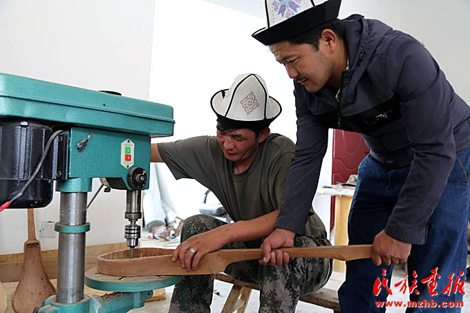 這間工作室的主人叫阿吉別克·買買達洪,主人恰巧有事外出,他的弟弟,年輕朝氣的吾蘭別克張羅著給記者們當(dāng)起了翻譯。正忙活著打磨樂器的小伙叫木沙,今年31歲,問起庫姆孜的制作工藝,他才把頭抬起來,笑著說:“我做這個十年了。一把庫姆孜,往往琴身是杏木,蓋子是松木。杏樹、松樹木切割后放在干燥的地方,一兩年后才能用?!睅炷纷斡腥遥傧乙郧坝脛游锏哪c子手工自制,現(xiàn)在有的工匠開始使用現(xiàn)成的弦。判斷庫姆孜手工藝人手藝高低的關(guān)鍵何在?木沙解釋說,“要看彈出來的聲音。木頭的原料不同,出來的聲音也不同?!边@個回答似乎也隱藏了手工藝人的絕活所在,可意會不可言傳的技藝,往往在一代代的工匠手中以師徒親授的方式傳承。