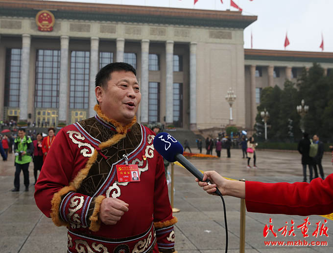 十九大代表尤明國(guó)(赫哲族)在會(huì)議期間接受記者采訪(滕俊 攝影)