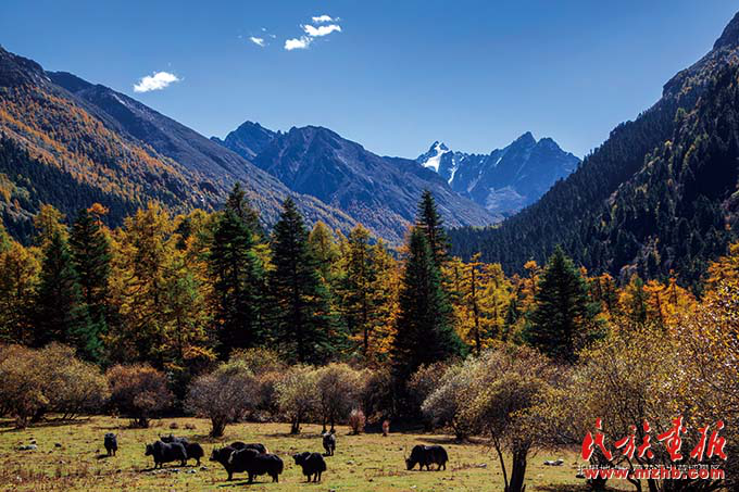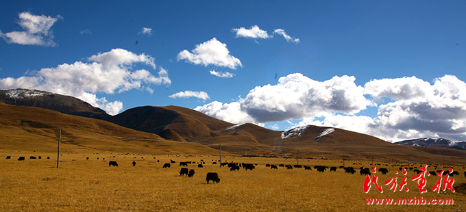 甘孜州的藍(lán)天白云、安詳牧群,金黃色西洋油畫般的美景吸引著八方游人(民族畫報(bào)社 列來(lái)拉杜攝影)