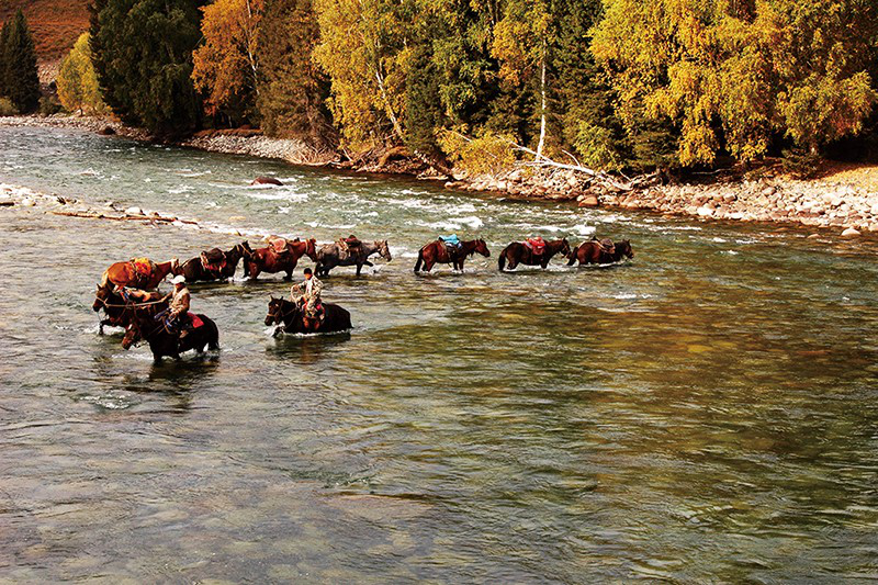 這時(shí)候,一位哈薩克族牧民騎著馬一邊往這邊走,一邊唱著歌。空曠的夜晚因?yàn)橥蝗挥辛怂母杪?,一下子便被打破了寧靜和孤獨(dú)。他走到我跟前,從馬上跳下來,愣愣地望著月光中的阿克哈巴河。我覺得他有點(diǎn)奇怪,怎么突然瞅著阿克哈巴河就發(fā)起了呆。過了一會(huì)兒,他表情復(fù)雜地看了我一下,然后轉(zhuǎn)過身去,準(zhǔn)備牽馬離去。