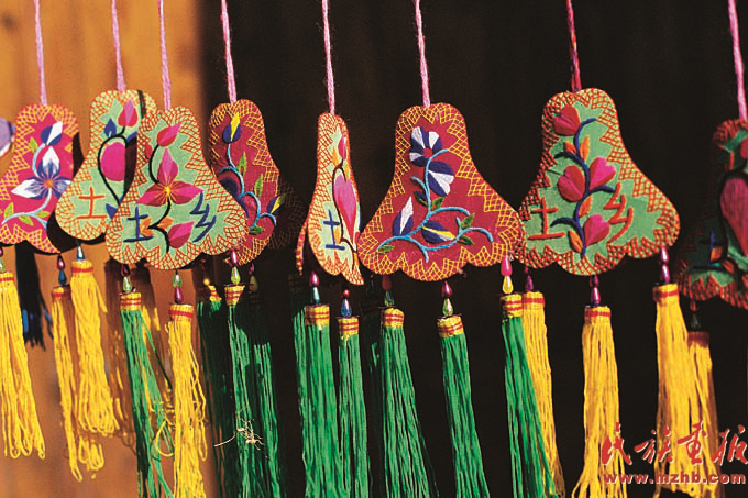 土族盤繡為當?shù)貗D女帶來了不少經(jīng)濟收入。圖為線條流暢、層次豐富、撞色奔放、針腳細膩的土族盤繡荷包(祁春英 攝影)
