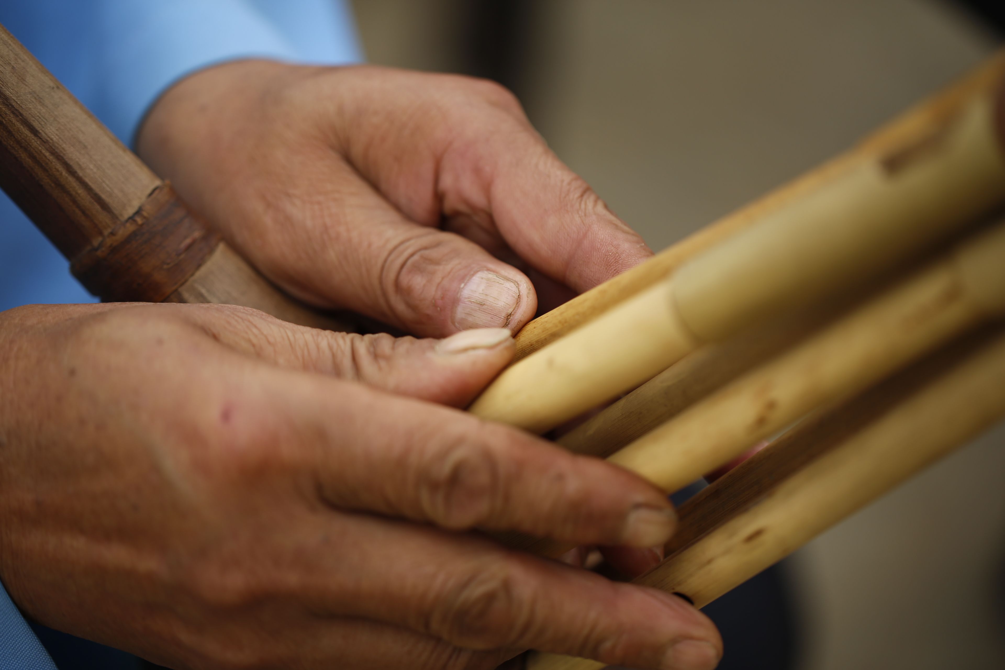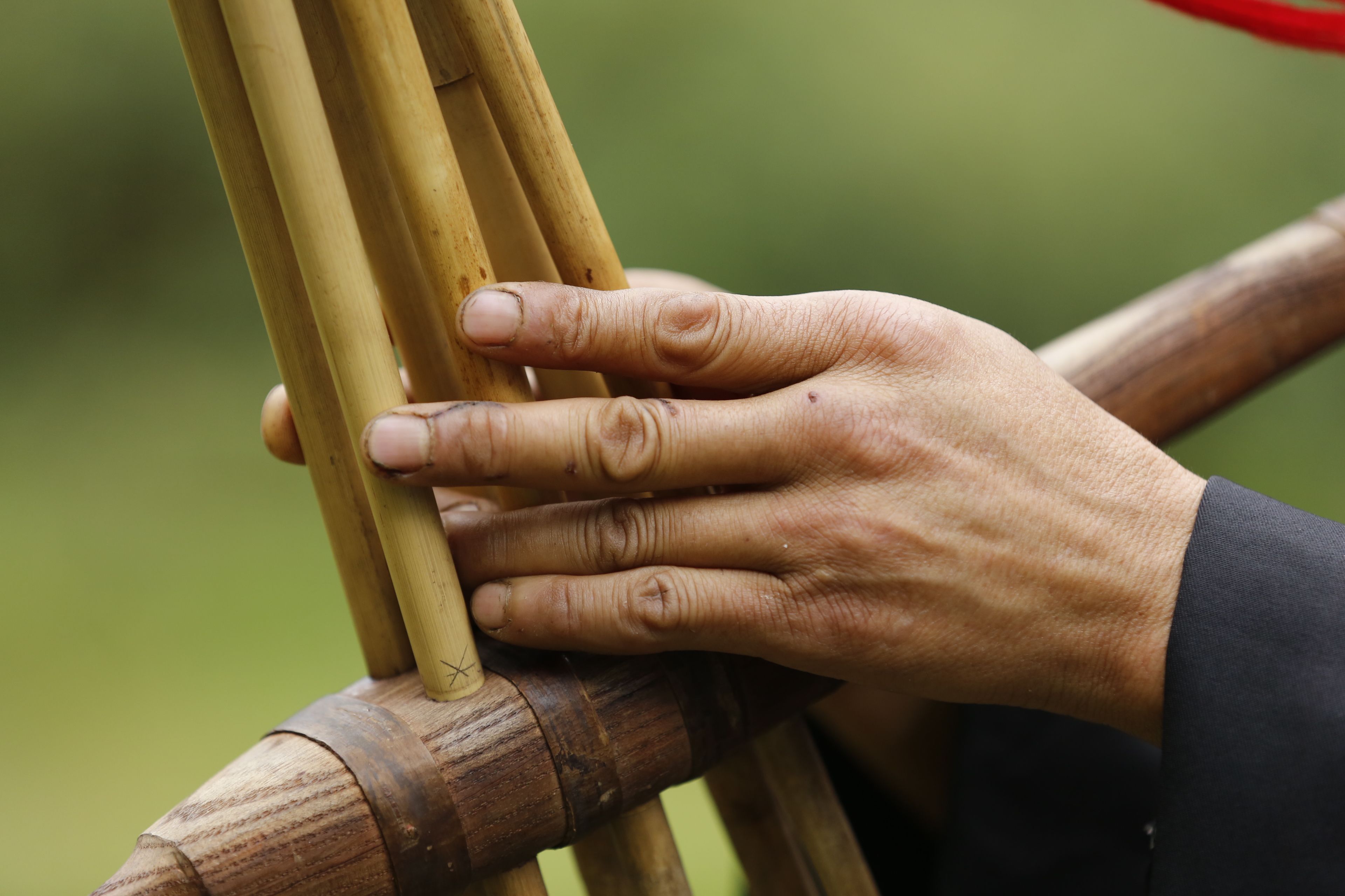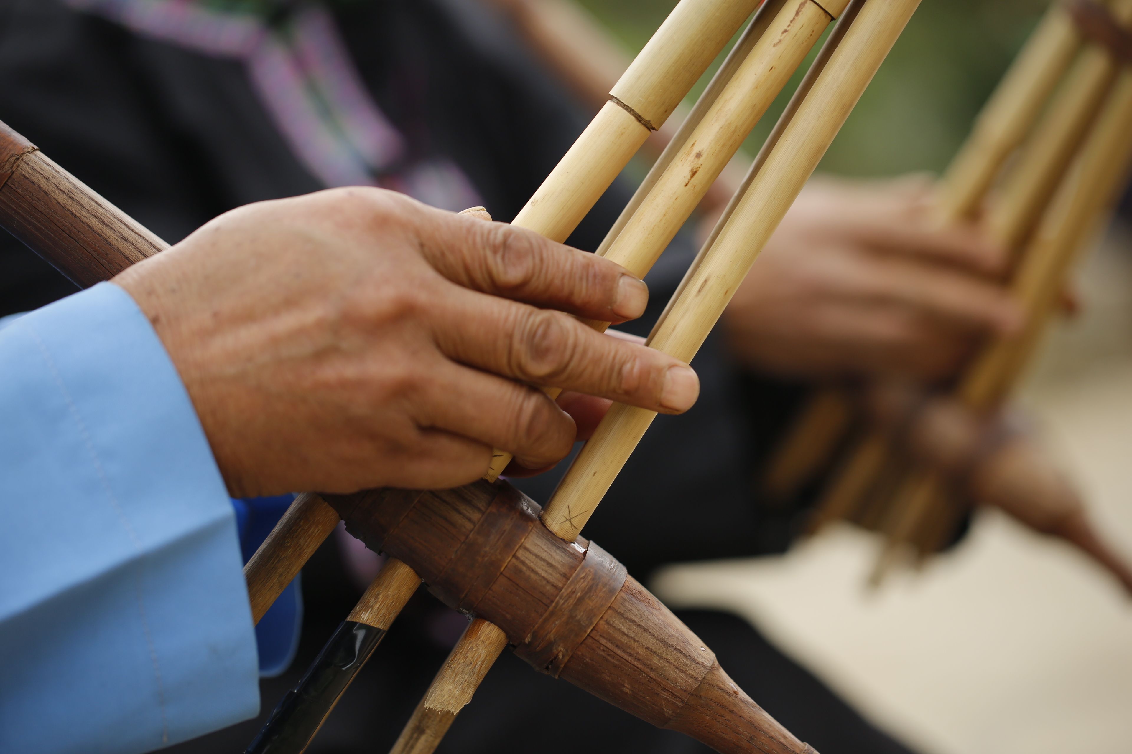 圖片說(shuō)明:貴州貴陽(yáng)苗族花鼓舞傳承人鄧開(kāi)倫教授他人吹奏蘆笙