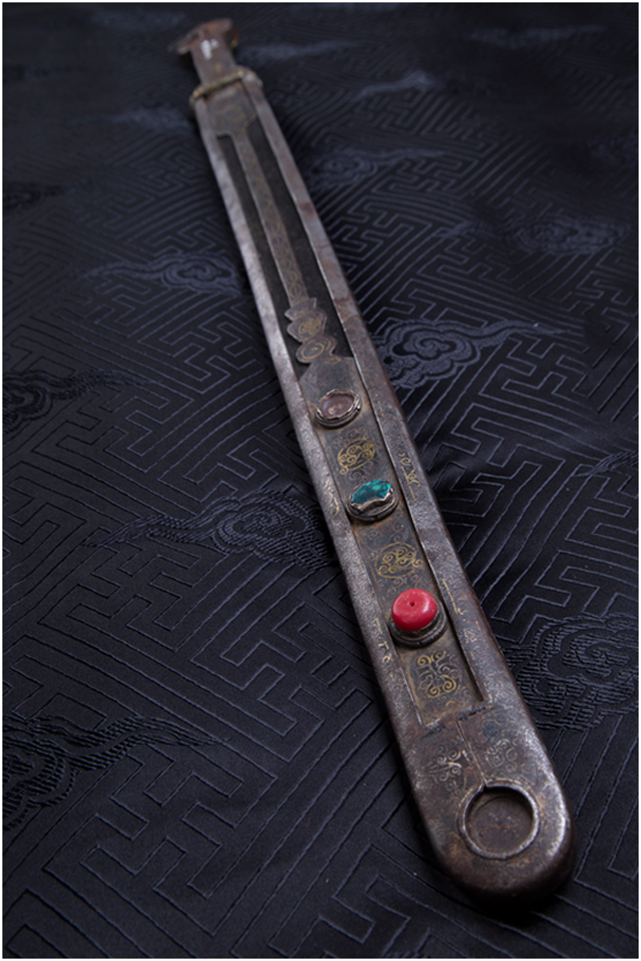 安多地區(qū)主要以放牧為主,牧民的刀主要用于宰殺和吃肉,有嚴格的男用女用之分,男式刀長度在一尺以上,女式刀在一乍左右,刀鞘的底部和刀柄的末端上翹,呈船形。安多人喜歡珠寶,頭飾、胸飾、腰飾無不光燦耀人,這些飾物同樣被用在刀上,刀鞘和刀柄錨金錯銀,鑲嵌著珊瑚和綠松石,像精美的藝術(shù)品。