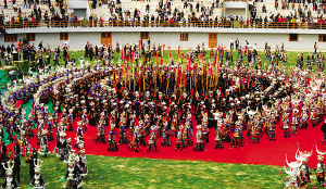 貴州省黔東南苗族侗族自治州雷山縣作為中國(guó)苗族歷史上大遷徙的集結(jié)地和中國(guó)苗族文化中心,以厚重獨(dú)特的文化,包括苗年在內(nèi)的11項(xiàng)文化遺產(chǎn)登上了中國(guó)非物質(zhì)文化遺產(chǎn)的殿堂。苗年是苗族一年中最重要的祭祀傳統(tǒng)節(jié)日,是苗家人的一大盛事,每年都有來自全國(guó)乃至全世界的游客到雷山參加苗年活動(dòng)。圖為紅火熱鬧的苗年歡慶場(chǎng)面。
