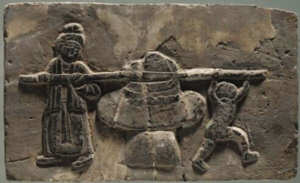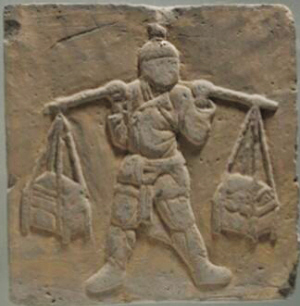 長30.5厘米,寬18.5厘米,厚5厘米,呈長方形。正面中間浮雕一挑擔(dān)男子,身穿右衽交領(lǐng)布衣、下著緊腿長褲,扁擔(dān)由后面搭在雙肩擔(dān),被所挑重物壓彎,極富動感。