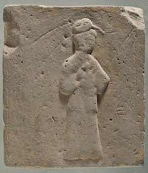 長30厘米,寬26.5厘米,厚4.5厘米,呈長方形。畫面中央刻有一位仕女形象。仕女儀態(tài)端莊,發(fā)髻高高盤起,衣著長裙,雙手抱著一個長柄執(zhí)壺,輕移蓮步,徐徐向前,像是要給遠道而來的朋友斟上一杯家釀的美酒。
