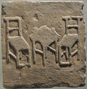 邊長20.5厘米,厚5厘米,呈正方形。駱駝構(gòu)圖充滿整張畫面。雙峰駝呈臥姿,頭部昂起,似乎是在傾聽什么,韁繩拴在木樁上,像是在等待主人拿來美味的草料。駱駝造型比例恰到好處,生動傳神。