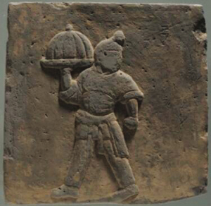 長30厘米,寬26.8厘米,厚5厘米。畫面中央為一男仆手持壺作行進狀。男仆頭戴幘巾,身著翻領(lǐng)長袍,雙袖卷起至肘部,前襟卷起掖于腰帶上,左手持有蓋長柄執(zhí)壺,穿長褲,足穿靸鞋,上身前傾,似乎聽到主人的呼喚,正在匆忙前去斟酒服侍,整體畫面形象生動。