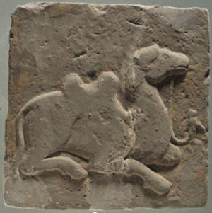 邊長30.5厘米,厚5厘米,呈方形。畫面中央為一人用手托舉鳥籠圖。人物以浮雕的方法突出總體輪廓,衣飾細部花紋則用線刻,腿部和臂部的肌肉繃起,形成了合理的藝術(shù)夸張。