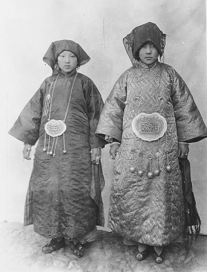 這是美國傳教士畢敬士影集中收錄的卡特·霍頓拍攝的又一張和撒拉族新娘有關(guān)的照片,此片也攝于青海循化。照片中的兩位撒拉族姑娘穿著鮮艷漂亮的衣服和翹尖的繡花鞋,佩戴著銀制的胸飾、墜子、項(xiàng)鏈、耳環(huán)和頭飾等。