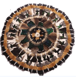 這張拼毯使用了馴鹿、貂熊、紫貂、黃鼬等多種獸皮毛,整體呈放射狀向外延展,構圖嵌色五彩斑斕,品質十分精美。為了制作這張拼毯,老人花了整整5年時間收集獸皮。僅野鴨頭頸部的一小塊孔雀綠羽毛,她就收集了近40塊,成為了整塊拼毯的亮點。