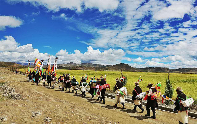 節(jié)日的第一天早晨,當(dāng)陽光撒滿金黃麥田的時(shí)候,農(nóng)民們手持麥穗圍著農(nóng)田轉(zhuǎn)圈游行,最前邊是由喇嘛和老年農(nóng)民組成的儀仗隊(duì),高舉佛像,背著經(jīng)書,吹著佛號(hào),感謝上天給人們帶來了風(fēng)調(diào)雨順的好年成。轉(zhuǎn)完麥田以后,照例要在廣場上舉行群眾性文娛體育活動(dòng),其中有藏戲、歌舞、跑馬、射箭、拔河等,十分熱鬧。這天,家家戶戶都要準(zhǔn)備充足的酒食,穿上最漂亮的衣服,或者在廣場四周的草場上野餐,或者在村子里邀集親朋好友宴飲。青年男女則喜歡在晚上圍著篝火跳舞,對唱情歌,直到深夜。