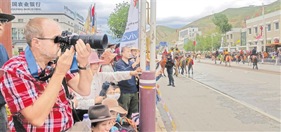 外國(guó)游客拍攝街頭巡游的馬術(shù)方隊(duì)