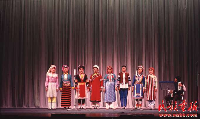 第一屆全國(guó)少數(shù)民族文藝會(huì)演于1980年9月20日至10月20日舉行。迄今為止,全國(guó)少數(shù)民族文藝會(huì)演已成功舉辦五屆。全國(guó)少數(shù)民族文藝會(huì)演是展示黨的民族政策和民族文化建設(shè)偉大成就的舞臺(tái),是展示少數(shù)民族自豪感和自信心的舞臺(tái),是展示各民族文藝工作者卓越才華的舞臺(tái),更是在中華民族大家庭里各民族“手足相親、守望相助”“共同團(tuán)結(jié)奮斗,共同繁榮發(fā)展”的真實(shí)寫(xiě)照。圖為第一屆全國(guó)少數(shù)民族文藝會(huì)演中女聲小組演唱《民族團(tuán)結(jié)開(kāi)新花》《民族畫(huà)報(bào)》1981年第1期
