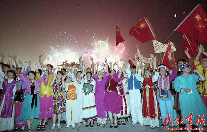 1997年7月1日零點(diǎn),中華人民共和國(guó)國(guó)旗和香港特別行政區(qū)區(qū)旗在香港升起,經(jīng)歷了百年滄桑的香港回到祖國(guó)的懷抱,中國(guó)政府開(kāi)始對(duì)香港恢復(fù)行使主權(quán)。香港回歸祖國(guó),舉國(guó)上下一片歡騰。各族人民以隆重而熱烈的方式,歡呼五星紅旗在香港特別行政區(qū)高高飄揚(yáng)。圖為首都各民族學(xué)生熱烈慶祝香港回歸?!睹褡瀹?huà)報(bào)》1997年第9期