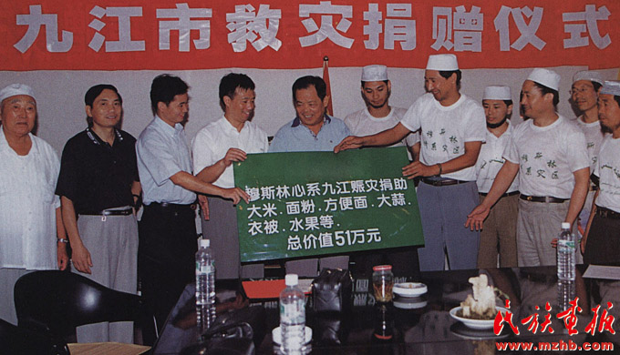 1998年,長(zhǎng)江發(fā)生了全流域的特大洪水,災(zāi)情牽動(dòng)著全國(guó)各族人民的心,舉國(guó)掀起了“情系災(zāi)區(qū)、奉獻(xiàn)愛(ài)心”的賑災(zāi)熱潮。圖為回族企業(yè)代表在江西省九江市政府舉行捐贈(zèng)儀式?!睹褡瀹?huà)報(bào)》1998年第12期