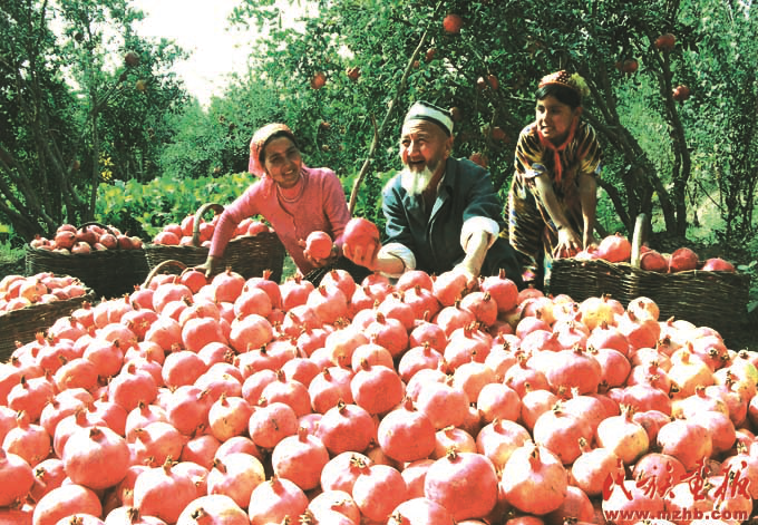 興邊富民行動(dòng)是1999年中央民族工作會(huì)議部署的一項(xiàng)重要的邊境建設(shè)工程,旨在“富民、興邊、強(qiáng)國(guó)、睦鄰”。興邊富民行動(dòng)為新疆的發(fā)展帶來(lái)了實(shí)惠,2006年,看著豐收的石榴,維吾爾族農(nóng)民樂(lè)開(kāi)了花。《民族畫(huà)報(bào)》2007年7期