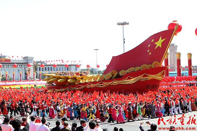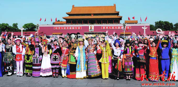 新中國(guó)成立以來(lái),黨和國(guó)家始終堅(jiān)持把馬克思主義民族理論同中國(guó)民族問(wèn)題具體實(shí)際相結(jié)合,始終堅(jiān)持把民族工作作為一項(xiàng)重大工作來(lái)抓,團(tuán)結(jié)帶領(lǐng)全國(guó)各族人民共同團(tuán)結(jié)奮斗,共同繁榮發(fā)展,開(kāi)創(chuàng)了中國(guó)特色解決民族問(wèn)題的正確道路,取得了舉世矚目的成就,積累了彌足珍貴的成功經(jīng)驗(yàn)。2009年10月1日,在北京天安門(mén)廣場(chǎng),20萬(wàn)軍民以盛大的閱兵儀式和群眾游行歡慶新中國(guó)60華誕,圖為各民族學(xué)生參加“團(tuán)結(jié)奮進(jìn)”方陣群眾游行?!睹褡瀹?huà)報(bào)》2009年第10期