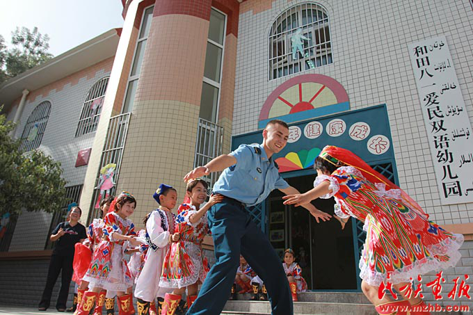 民族團(tuán)結(jié)是國(guó)家統(tǒng)一、繁榮昌盛的前提和保證,各民族“共同團(tuán)結(jié)奮斗,共同繁榮發(fā)展”是我國(guó)民族工作的主題。全國(guó)各地扎實(shí)開(kāi)展民族團(tuán)結(jié)進(jìn)步創(chuàng)建工作,平等團(tuán)結(jié)互助和諧的社會(huì)主義民族關(guān)系進(jìn)一步鞏固和發(fā)展。2011年,空軍駐新疆和田某指揮所首次投資80萬(wàn)元,開(kāi)辦了和田八一愛(ài)民雙語(yǔ)幼兒園,讓30個(gè)家庭的孩子進(jìn)入雙語(yǔ)班成為首批“藍(lán)天春蕾兒童”。圖為維吾爾族戰(zhàn)士艾力夏提和該園兒童一起玩老鷹捉小雞游戲。《民族畫(huà)報(bào)》2011年第11期
