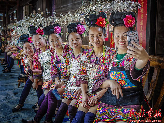 經(jīng)歷改革開(kāi)放40年的發(fā)展,我國(guó)社會(huì)生產(chǎn)力、綜合國(guó)力、人民生活水平實(shí)現(xiàn)了歷史性跨越,全黨全國(guó)各族人民要更加緊密地團(tuán)結(jié)在以習(xí)近平同志為核心的黨中央周?chē)?,高舉中國(guó)特色社會(huì)主義偉大旗幟,不忘初心,牢記使命,將改革開(kāi)放進(jìn)行到底,不斷實(shí)現(xiàn)人民對(duì)美好生活的向往,在新時(shí)代創(chuàng)造中華民族新的更大奇跡。圖為貴州民眾盛裝自拍。《民族畫(huà)報(bào)》2018年第3期