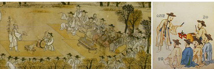 盤嗦哩通常由一人演唱,另一人用鼓伴奏。這種形式大約在18世紀中朝鮮王朝后期開始出現(xiàn),19世紀末是它的黃金時代。關(guān)于它的起源有兩種不同的看法,一種認為它是18世紀的游浪藝人根據(jù)某種戲劇創(chuàng)造的,另一種則認為是來源于薩滿教儀式中的歌曲。盤嗦哩的故鄉(xiāng)是韓國全羅北道的南原,至今那里仍盛行這種演唱。