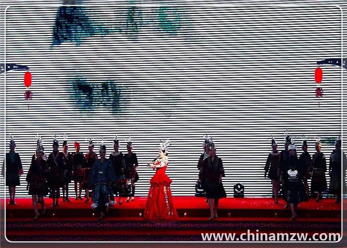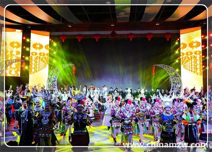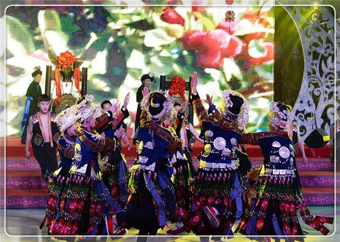 晚會由240位貴州各地苗族演員,50位苗族、布依族、侗族、仡佬族、彝族、土家族、回族等17個少數(shù)民族演員,在主持人的開場白介紹中,手持燈花、衣著盛裝在鼓點笙曲中步入會場。