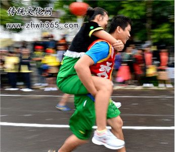 在昌江黎族自治縣一帶流行。每年的農(nóng)歷十五前后,孩子們就聚居在一空曠地,舉行村與村之間比賽??筛鶕?jù)人數(shù)來分組,每組2人(一男一女),每次由兩組進(jìn)行,實(shí)行淘汰制,男背著女或女背著男亦可,與對(duì)方互相碰撞,男女通過踢、拉、推等動(dòng)作,千方百計(jì)地把對(duì)方背著的人或拉下,或把兩人分開,或倒地。在場(chǎng)觀看的人興高采烈,笑聲不斷,其樂無窮。