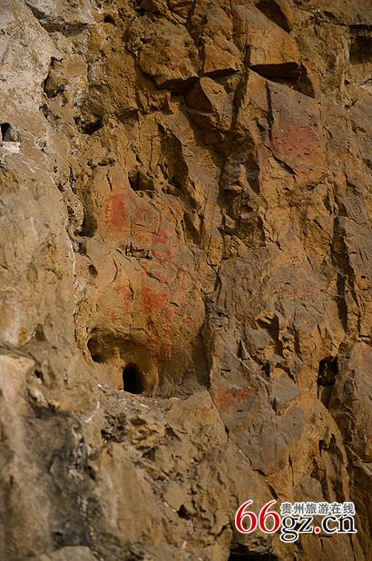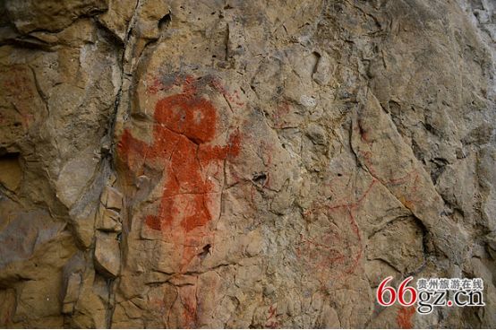 據(jù)資料載,金山洞古代崖畫以赭色涂繪人、馬、狗等等,隱約可見形態(tài)各異的大小圖像二三十個。人物多作行走狀,亦有雙手高舉者,似乎在祈禱。從其畫風(fēng)觀察,與相距不遠的省級文物保護單位--長順龍家院崖畫十分相似。