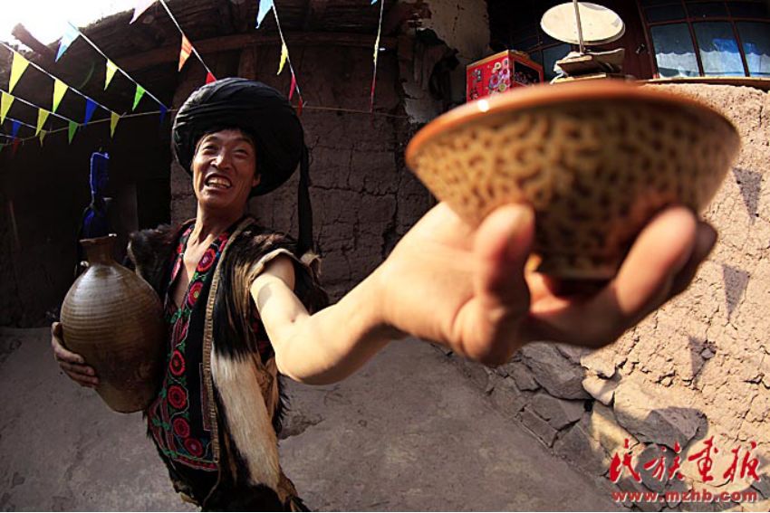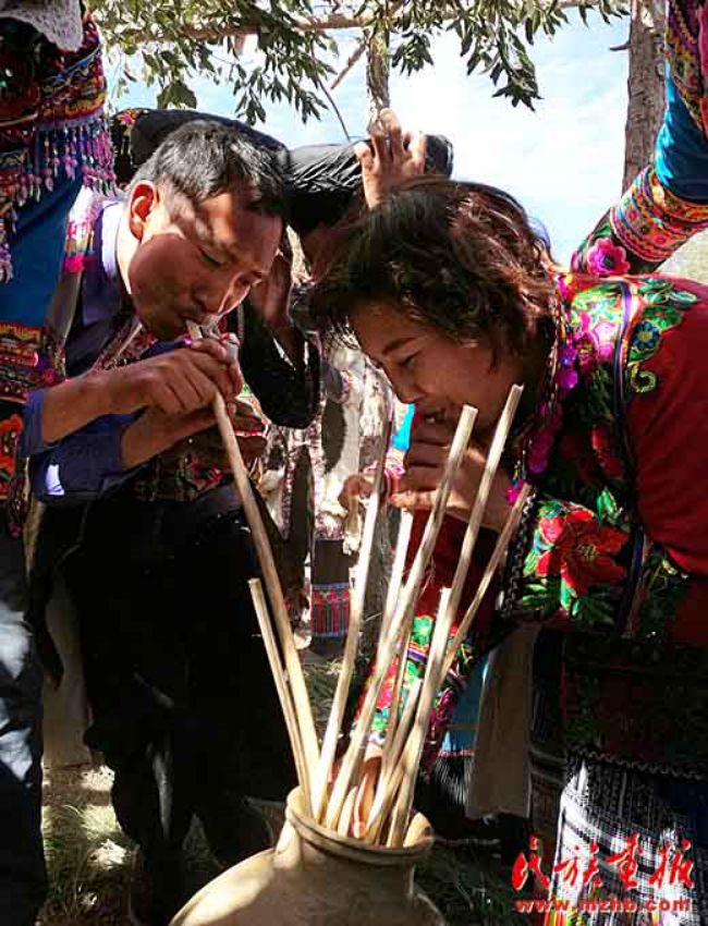 主人家抬出幾大壇米酒,拿出幾十根空心麻桿插入壇內(nèi),供吸吮米酒