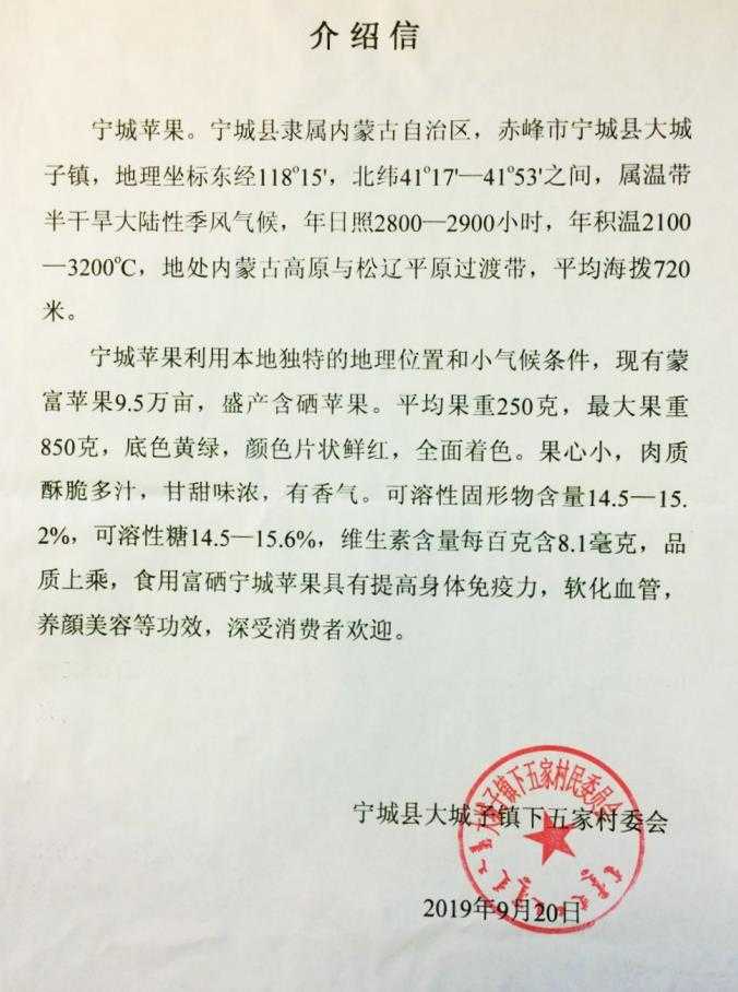 寧城蘋果是寧城縣巴林果樹試驗(yàn)場(chǎng)與沈陽(yáng)農(nóng)業(yè)大學(xué)合作,于1978年以哈爾濱東光蘋果為母本和日本富士蘋果為父本雜交而來(lái),經(jīng)過十幾年時(shí)間選育而成的蘋果。1997年內(nèi)蒙古自治區(qū)科學(xué)委員會(huì)組織國(guó)內(nèi)著名果樹專家進(jìn)行鑒定,定名為蒙富,寓意內(nèi)蒙古的富士。2015年7月“寧城蘋果”通過國(guó)家工商總局商標(biāo)局注冊(cè),取得“寧城蘋果”地理標(biāo)志證明商標(biāo),推動(dòng)了本地蘋果產(chǎn)業(yè)健康快速發(fā)展。