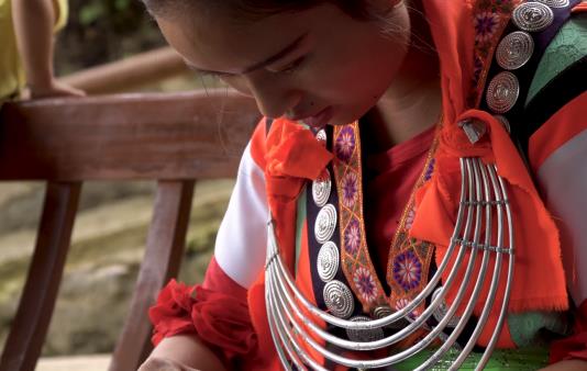 谷灑村苗族服飾上的圖案,呈現(xiàn)多元化的風格,這是因為苗族女子的服飾往往都出自她們自己的手中,每件服飾都有著個人風格。谷灑村苗族喜歡在古井的涼亭上刺繡,這里涼風習習,是她們納涼刺繡最好不過的地方。同伴坐在一起,這樣以便于互相指點,學習對方的長處、彌補自己的短處。