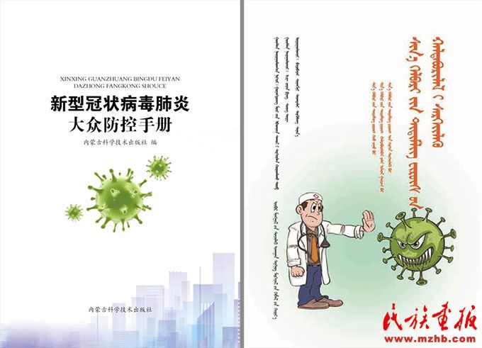 內蒙古科學技術出版社出版的《新型冠狀病毒肺炎大眾防控手冊》(蒙古文版、電子版)。