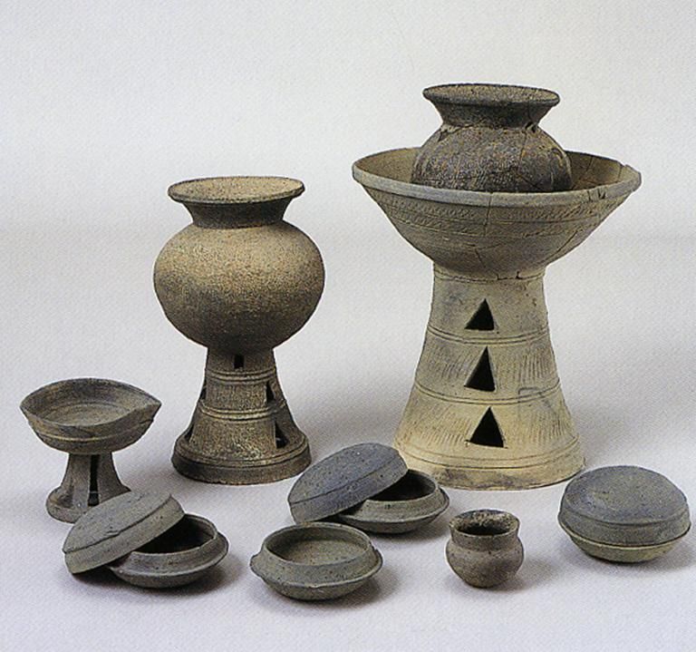 古墳時(shí)期另一種陶器為須惠器(圖十二),比土師器精美。它在古墳時(shí)代中期才從大陸引進(jìn)而來,由朝鮮半島的“陶部”工人在相對集中的場所制作,采用輪制技術(shù),器物呈青灰色,器形富于變化,主要為壺、瓶、盤、碗和高腳杯等。