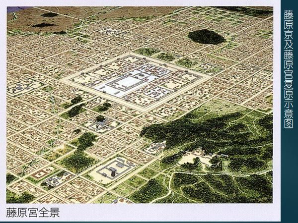 飛鳥-奈良時(shí)代對作為中央集權(quán)國家的象征的都城建設(shè),極其重視。藤原京是持統(tǒng)、元明、元正三代天皇延用了16年的都城遺址,這個(gè)遺址經(jīng)過幾十年的考古發(fā)掘,已經(jīng)探明了藤原京和藤原宮的范圍及布局(圖二十)。京城東西及南北各長5.3km,平面近正方形,宮城在其中央,這點(diǎn)與唐長安城不同。有學(xué)者認(rèn)為,藤原京是以《周禮》規(guī)定的理想化都城建制為依據(jù)所筑成的。