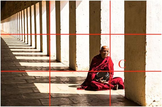 這三張圖都是就是黃金交叉點構(gòu)圖的應用,第三張是在緬甸的拍的,當時這個僧人坐在有光的長廊里,他的頭不在交叉點上,但落在相對差不多的位置。