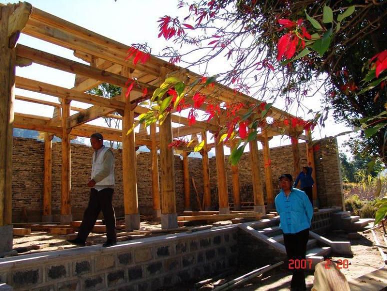 阿昌族建房傳統(tǒng)用工多是相互幫忙,全村協(xié)作,只吃飯而不付酬。建房一般分為“選材備料”“看風水擇房基”“動土奠基” “立柱成屋”等幾大程序。
