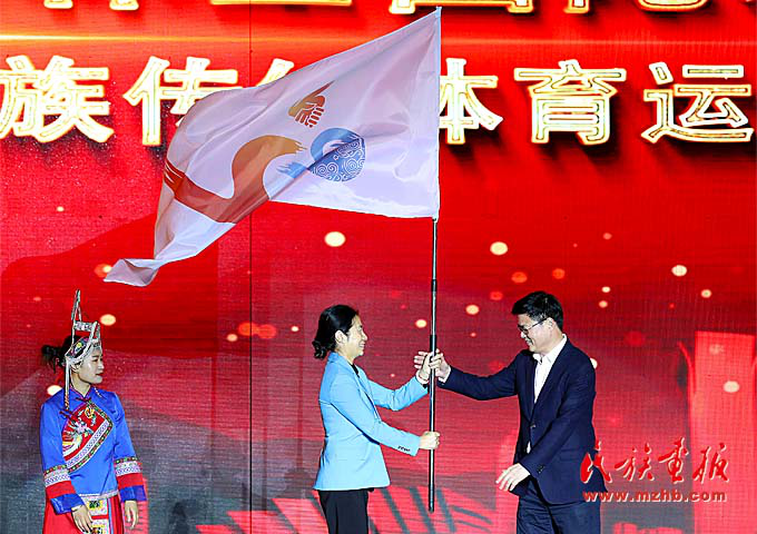 國(guó)家民委監(jiān)督檢查司司長(zhǎng)隋青向運(yùn)動(dòng)會(huì)授旗。