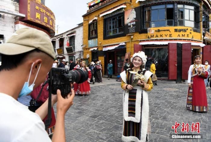 圖為7月24日,游客穿上藏族傳統(tǒng)服飾在拉薩市八廓街拍照留念。 中新社記者 貢嘎來(lái)松 攝